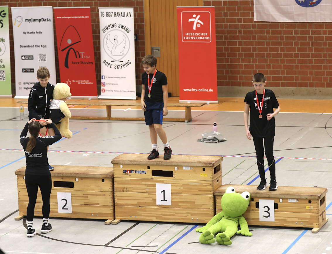 In der AK 4 männlich konnte Johannes Ecker die meisten Medaillen sammeln. Er wurde Hessenmeister in den Disziplinen 30 sec Speed und 3 min Speed, kam mit 2,97 Punkten auf den 2. Platz im Freestyle und belegte im Double Under mit 54 Doppeldurchschlägen den 3. Platz. Somit konnte er am Ende des Tages einen ganzen Medaillensatz mit nach Hause nehmen und freute sich riesig über den Vize-Hessenmeister-Titel mit 946 Punkten im Gesamtwettbewerb.