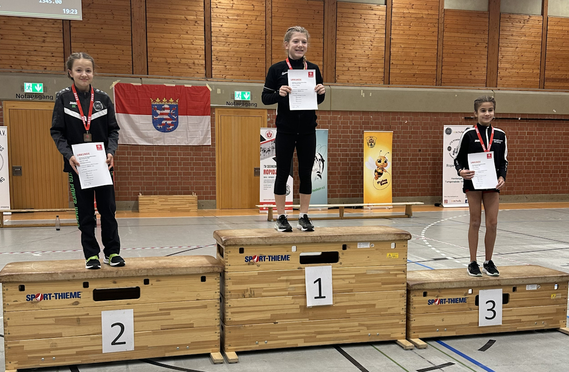 Bei den älteren Mädchen in der Altersklasse 4 (Jahrgänge 2013/2014) konnte Zoé Veidt mit soliden Leistungen in allen Disziplinen glänzen. Sie belegte am Ende des Tages mit 1.449 Punkten den 2. Platz und ist somit Vizehessenmeisterin hinter Samira Walther von der TG Hanau (1.536 Pkte). Damit konnte sie sich im Vergleich zum Vorjahr deutlich steigern. Auch Valerie Perel hat erstmals an der hessischen Einzelmeisterschaft teilgenommen und belegte mit 958 erreichten Punkten einen respektablen Platz 22.
